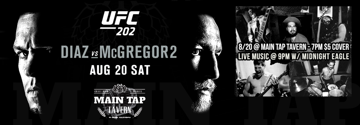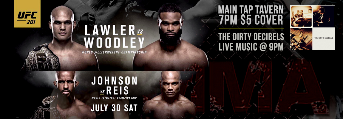 Main Tap Tavern 518 E Main St, El Cajon, CA 92020, El Cajon, CA, United StatesUFC 201: Lawler vs. Woodley (7pm - $5 Cover) Your spot for watching UFC while drinking great craft beer is at the Main Tap Tavern! UFC 201 will be Saturday, July 30th at 7pm! $5 cover!! Stay after the fight for live music with Dirty Decibels. Call ahead to reserve tables of 4 or…