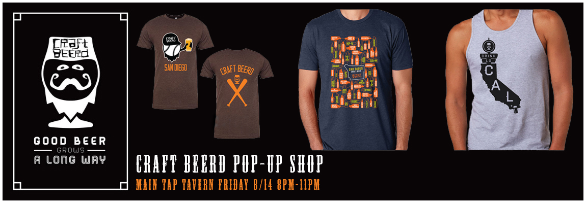 Main Tap Tavern 518 E Main St, El Cajon, CA 92020, El Cajon, CA, United StatesCraft Beerd Pop-up Shop @ Main Tap Tavern 8pm-11pm. Join Main Tap and Rudy as he displays the latest creation from the ever so popular San Diego Beer Clothing line Craft Beerd. There will be tons of hats, shirts, and accessories for you to purchase.